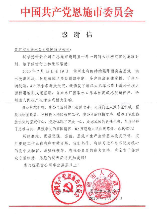 8月4日,一封由恩施市委、市政府聯(lián)合署名的感謝信寄到了黃石市自來(lái)水有限公司,感謝他們?cè)谇岸螘r(shí)間恩施遭遇特大洪澇災(zāi)害之時(shí)的緊急援助。