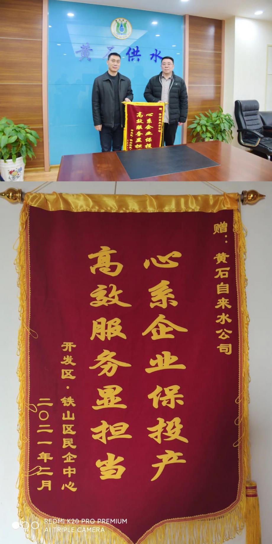 2月8日上午,開發(fā)區(qū)·鐵山區(qū)民企中心專程來到市自來水有限公司贈送錦旗,對公司保障落戶企業(yè)用水,提供主動作為、高效周到的服務(wù)表達謝意。開發(fā)區(qū)·鐵山區(qū)民企中心副主任徐永華代表民企中心授錦旗。公司黨委委員、副總經(jīng)理袁全保代表公司接錦旗。