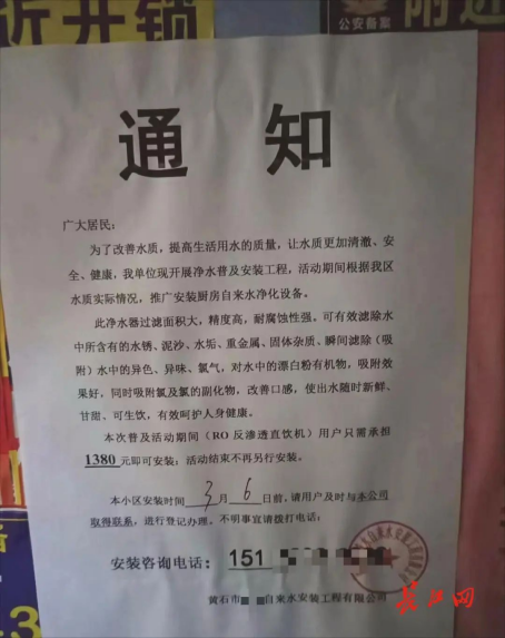 “此凈水器過(guò)濾面積大,精度高,耐腐蝕性強(qiáng),可有效濾除水中所含有的水銹、泥沙、水垢、重金屬、固體雜質(zhì)、瞬間濾除(吸附)水中的異色、異味、氯氣、對(duì)水中的漂白粉等有機(jī)物,吸附效果好……”在一張通知中,記者看到,這張蓋有“黃石市某自來(lái)水安裝工程有限公司”的印章的通知中,有大量文字描述該凈水設(shè)備的優(yōu)點(diǎn),并表示活動(dòng)結(jié)束后,將不再另行安裝。