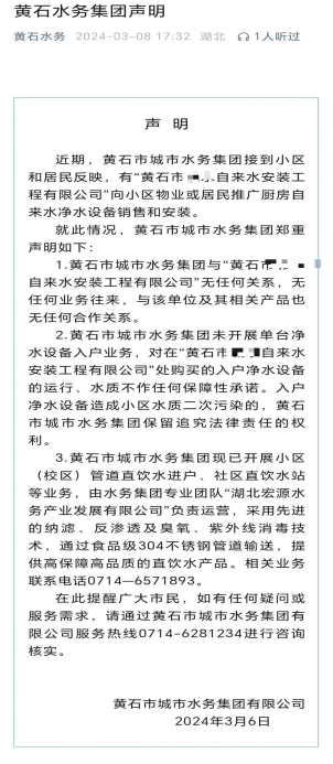 黃石市城市水務(wù)集團(tuán)有限公司發(fā)布的聲明。
